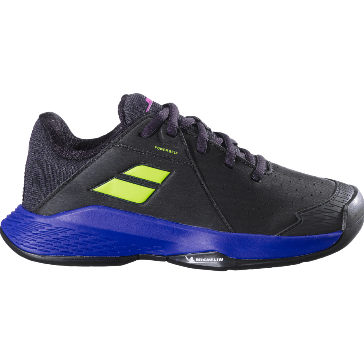 - Semelle extérieure Michelin : Inspirée des pneus de rallye, la semelle possède une excellente performance sur une plus longue durée. Forme et profil de la semelle, sculptures et formulation sont autant de variables qui font la force des semelles des chaussures Babolat.